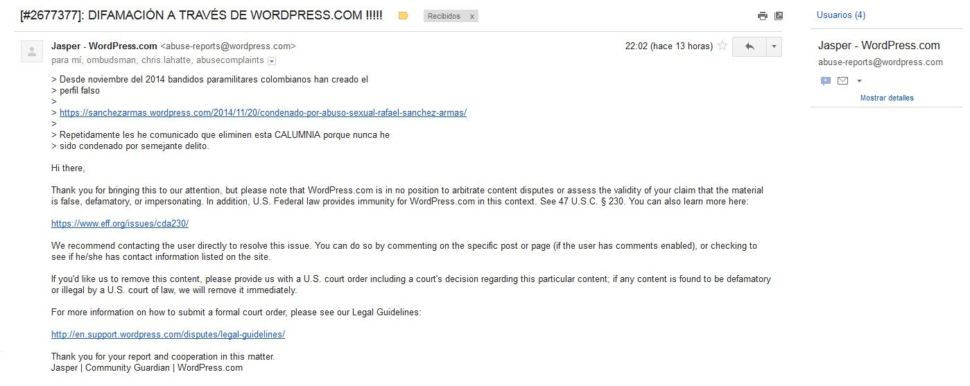 ¿Puedo yo decir esto siendo mentira? ¿Entonces por qué wordpress.com permite que me difamen? Cuando la calumnia publicada por los paramilitares colombianos en wordpress.com, empresa dirigida por este sujeto, Matt Mullenweg, tal como aparece en mi demanda contra España según puede comprobarse en este documento, desaparezca de wordpress.com, procederé igualmente a borrar esta calumnia. Todos moros o todos cristianos.